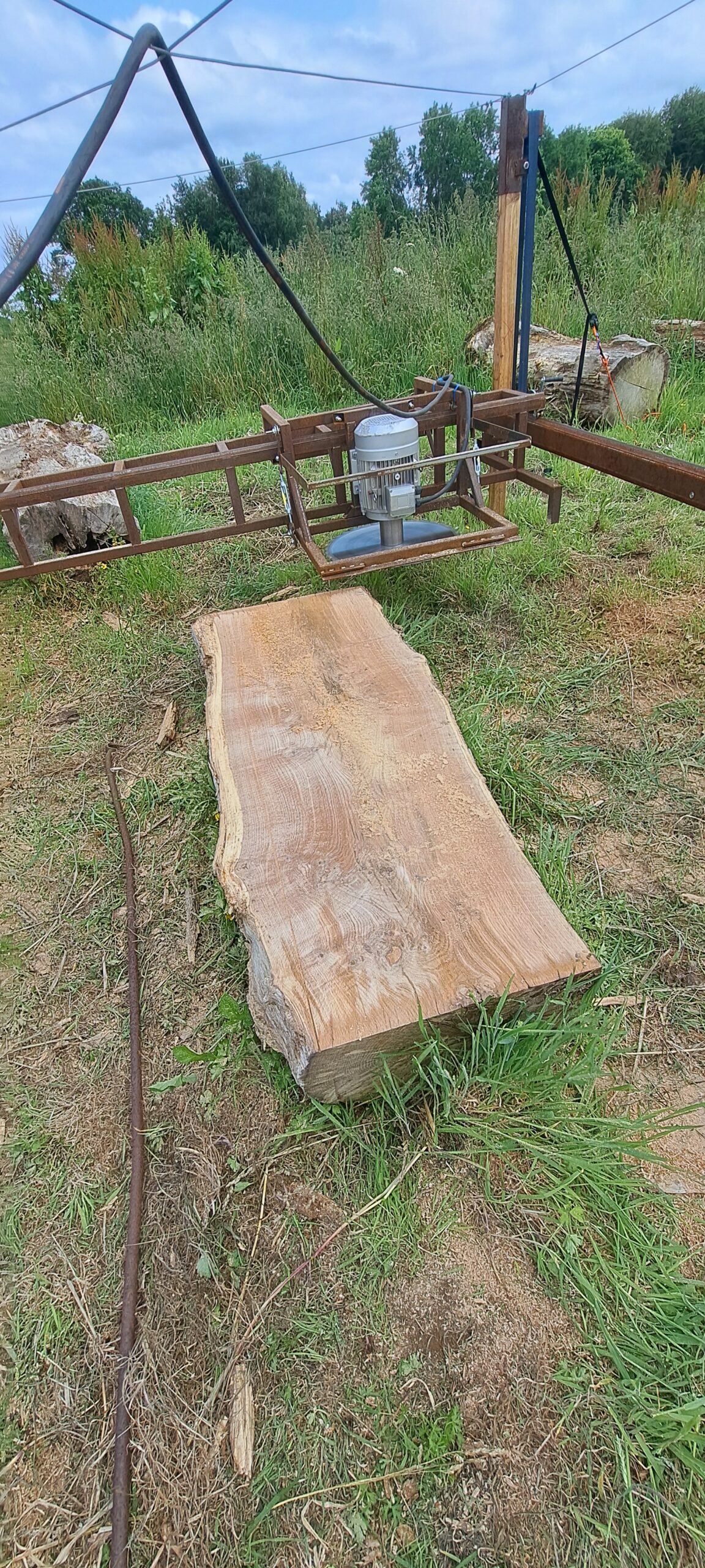 Unique dans notre région, cette scierie nomade, conçue et fabriquée dans nos ateliers, nous permet, sans jamais devoir déplacer des grumes extrêmement lourdes, de les débitées sur site en bois avivés au dimensions souhaitées.